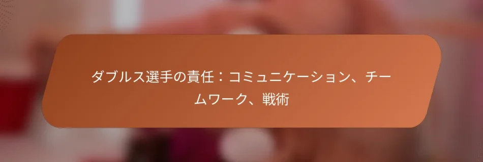 ダブルスの試合では、選手はコミュニケーション、チームワーク、戦術の実行に基づく重要な責任を共有します。役割を明確に定義し、強力なパートナーシップを育むことで、選手はパフォーマンスを向上させ、コート上での課題をより効果的に乗り越えることができます。 ダブルスの試合における選手の主な責任は何ですか? ダブルスの試合では、選手はコミュニケーション、チームワーク、戦術の実行に関する責任を共有します。各選手は自分の役割を理解し、勝利の可能性を最大化するために協力して働く必要があります。 ダブルスプレーにおける個々の役割の理解 ダブルスの試合では、各選手がチーム全体の戦略に貢献する特定の役割を持っています。通常、一方の選手はネットポジションを担当し、もう一方はベースラインに留まります。この役割分担により、攻撃と防御の両方にバランスの取れたアプローチが可能になります。 選手は試合前に自分の好みの役割をコミュニケーションし、誰がコートのどのエリアをカバーするかを明確にする必要があります。例えば、ネットプレーヤーはボレーをインターセプトすることに集中し、ベースラインプレーヤーは深いショットを返すことに集中できます。 柔軟性が重要です。選手はゲームが進化するにつれて役割を切り替える準備をしておくべきです。この適応力は、相手の戦略に対応し、弱点を突く上で重要です。 選手のポジショニングの重要性 適切なポジショニングはダブルスプレーにおいて重要であり、攻撃力と防御力の両方に影響を与えます。選手はコートを効果的にカバーするフォーメーションを維持し、相手が利用できる隙間を最小限に抑えるべきです。 ネットにいるとき、選手はショットをインターセプトするために自分の位置を調整し、パートナーの位置を意識する必要があります。この意識は、ショットを奪うべきか、パートナーに任せるべきかの迅速な判断に役立ちます。 ラリー中は、選手は三角形のフォーメーションを維持することを目指し、一方の選手がネットに、もう一方がベースラインにいるようにします。この設定により、より良いカバレッジと攻撃と防御の間の迅速な移行が可能になります。 攻撃的および防御的責任の定義 ダブルスでは、攻撃的および防御的な責任は共有されますが、選手の強みに基づいて異なる場合があります。ネットプレーヤーは通常、攻撃的な役割を多く担い、アグレッシブなボレーでポイントを決めることを目指します。 一方、ベースラインプレーヤーはサーブを返し、戦略的にショットを配置してポイントを設定することに集中すべきです。彼らは相手をポジションから引き出し、ネットのパートナーにチャンスを作ることができます。 効果的なコミュニケーションは、攻撃的なプレーと防御的なプレーの間を移行するための鍵です。選手は、攻撃から防御に切り替える際の意図を呼びかけるべきで、チームの一体感を維持します。 相手に基づく役割の適応 相手に適応することはダブルスの試合で重要です。選手は試合の早い段階で相手の強みと弱みを評価し、それに応じて戦略を調整する必要があります。例えば、相手チームに強力なネットプレーヤーがいる場合、ベースラインラリーに集中するのが賢明かもしれません。 選手はまた、相手のプレースタイルに基づいてポジショニングを変更することができます。相手が頻繁に一方にショットを打つ場合、チームはそのエリアをより効果的にカバーするためにフォーメーションをシフトできます。 休憩中に定期的に話し合うことで、チームはアプローチを洗練させ、試合のダイナミクスに応じて反応し続けることができます。 状況に応じた責任の認識 状況認識はダブルスプレーにおいて重要です。選手は自分が主導すべき時とパートナーをサポートすべき時を認識する必要があります。例えば、一方の選手がポジションを外れている場合、もう一方はそのエリアをカバーするように調整すべきです。 選手はまた、スコアや試合の文脈を意識する必要があります。重要なポイントでは、自信や相手の傾向に基づいて、より保守的または攻撃的にプレーすることを選ぶかもしれません。 試合の流れを定期的に評価することで、選手は自分の責任について情報に基づいた決定を下し、全体的なチームパフォーマンスを向上させることができます。 ダブルスの試合中に選手がコミュニケーションを改善するにはどうすればよいですか? 選手は明確な口頭戦略と非言語的合図を実施することで、ダブルスの試合中のコミュニケーションを強化できます。一貫したコミュニケーションシステムを確立し、効果的なドリルを練習することで、誤解を大幅に減らし、チームワークを改善できます。 口頭コミュニケーション戦略 明確な口頭コミュニケーションは、ダブルス選手が効果的に動きや戦略を調整するために不可欠です。選手は「私の!」や「あなたの!」のような